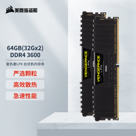 美商海盗船(USCORSAIR)64GB(32G×2)套装 DDR4 3600 台式机内存条 复仇者LPX系列 游戏型