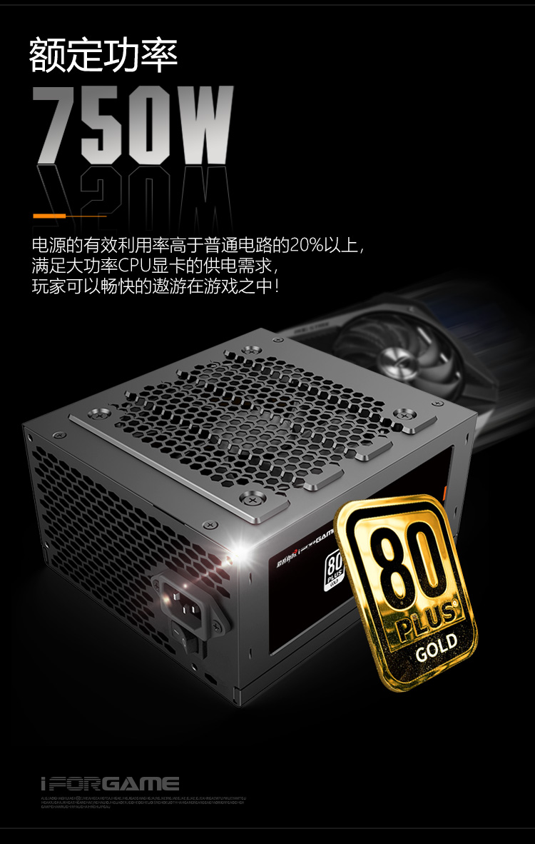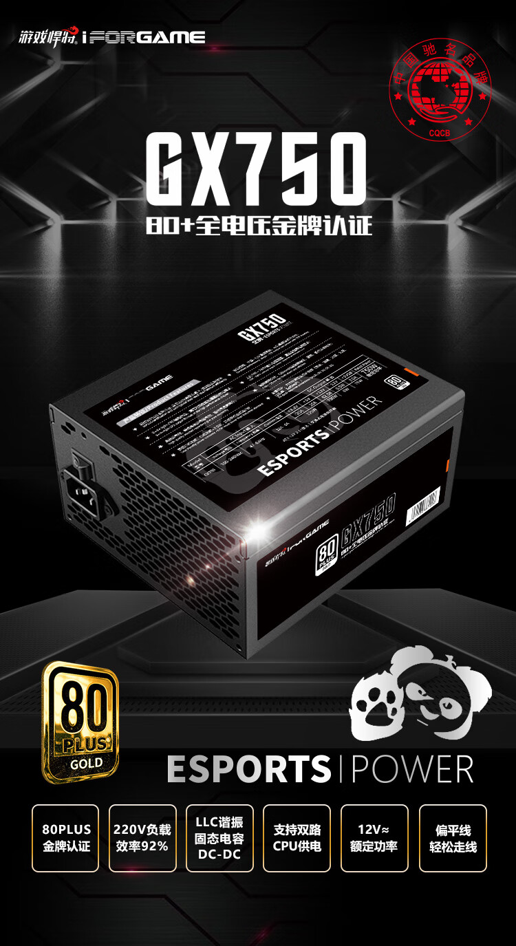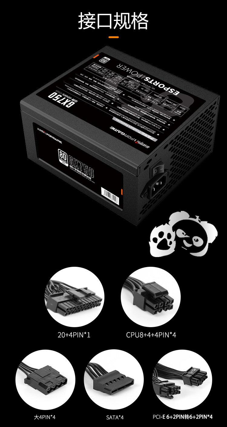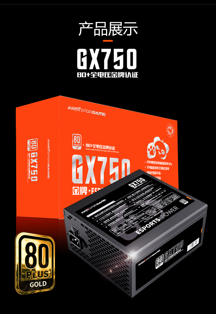 游戏悍将 熊猫GX750 额定750W 金牌电源 台式机电脑机箱电源(80PLUS/固态电容DC-DC/双路CPU供电/智能温控)