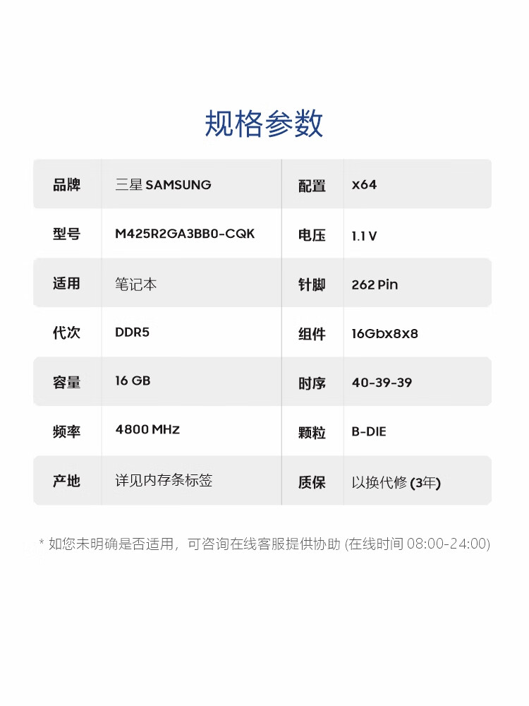 三星 SAMSUNG 笔记本内存条 16G DDR5 4800频率